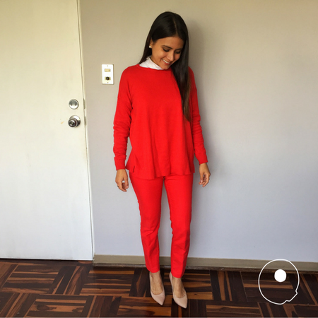 Uno de mis combinaciones favoritas al vestir para la oficina es optar por monocromo. No piensen que los peruanos siempre vestimos de negro. Aquí hay un toque una una explosión de color rojo alegre. Porque no quiero que mis accesorios compitan con las piezas principales, estoy usando accesorios en tonos neutrales. Me gusta sumar una pashmina con tonos similares. English here.