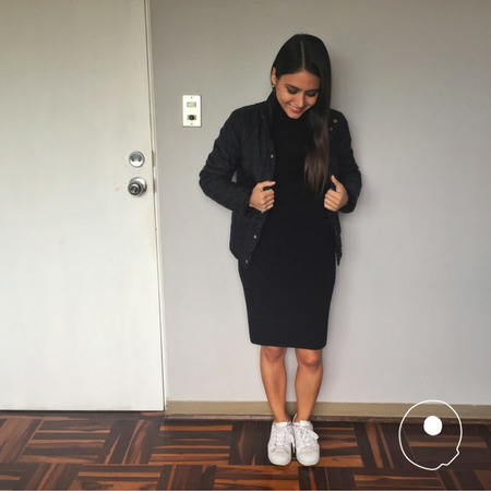 De este invierno me guardo un bonito recuerdo de un viernes por la noche en un vestido de suéter y zapatillas blancas. Siempre monocromática, agregué una casaca puffer negra. Tengo esta casaca desde la universidad (circa 2004). Me gusta la silueta de los ‘sweater dresses’, que son un poco ceñidos y cortos, con zapatillas blancas. Le agregué un labial rojo para ahuyentar a los malos espíritus.